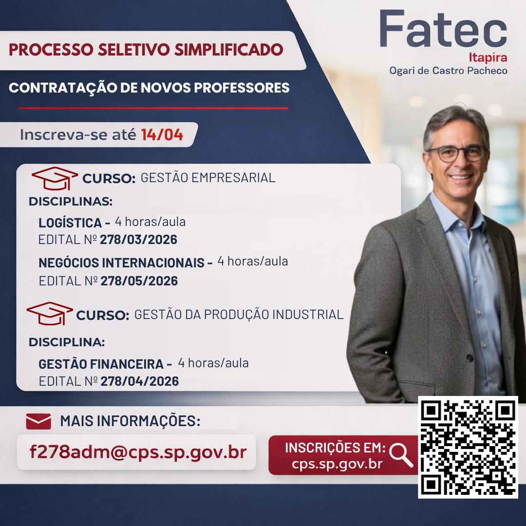 A Fatec Itapira “Ogari de Castro Pacheco” está com inscrições abertas para 5 seleções de docentes!