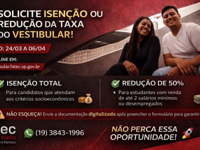 A Fatec de Itapira já vai abrir, a partir de amanhã (24/03), o prazo para solicitar isenção ou redução da taxa do Vestibular 2º semestre de 2026!