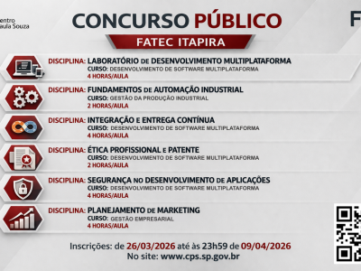 A Fatec Itapira “Ogari de Castro Pacheco” está com inscrições abertas para 6 CONCURSOS PÚBLICOS destinados à contratação de Professores de Ensino Superior.