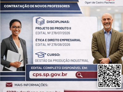A Fatec Itapira “Ogari de Castro Pacheco” está com inscrições abertas para 5 seleções de docentes! ✨ São:✔️ 3 Processos Seletivos Simplificados (prazo determinado)✔️ 2 Concursos Públicos (prazo indeterminado) 📚 Vagas disponíveis: 🔹 Logística (Gestão Empresarial) – 4h/aula noite🗓️ Inscrições: 31/03 a […]