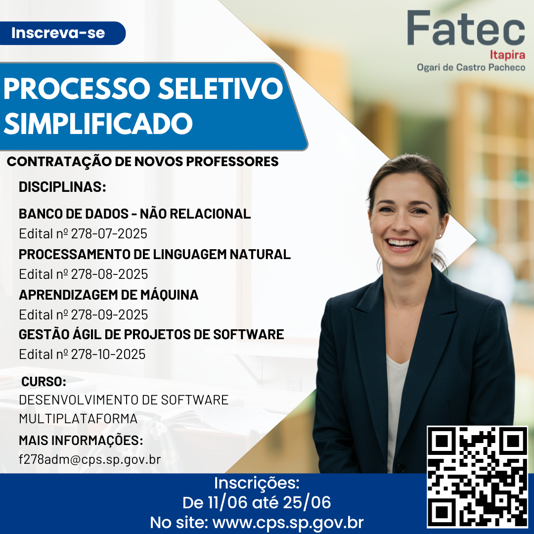 278/07/2025 DSM BANCO DE DADOS – NÃO RELACIONAL 4 hrs aula – Noturno Site CPS 278/08/2025 DSM PROCESSAMENTO DE LINGUAGEM NATURAL 4 hrs aula – Noturno Site CPS 278/09/2025 DSM APRENDIZAGEM DE MÁQUINA 4 hrs […]