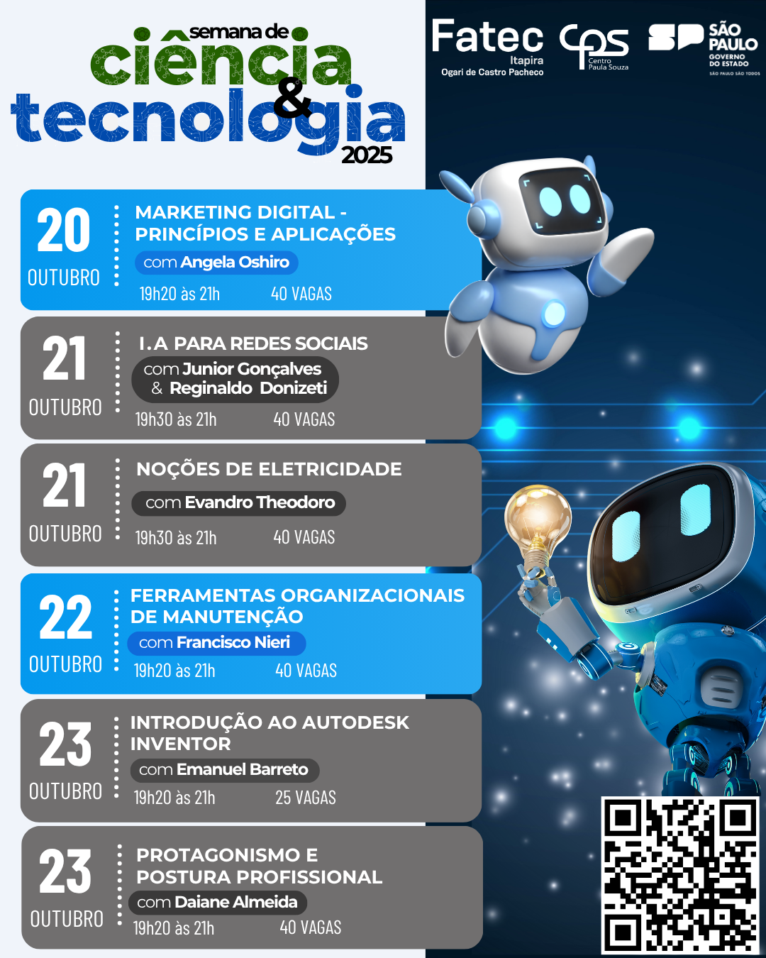 De 20 à 23 de outubro, a Semana de Ciência e Tecnologia da Fatec Itapira, traz palestras e minicursos gratuitos, abertos a toda a comunidade — uma oportunidade única para explorar novas ideias e desenvolver habilidades práticas!
